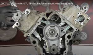 Consejos técnicos de Cloyes: Chrysler 4.7L Timing System Replacement Consejos de instalación |junio 8, 2020 Montaje rápido y preciso del piñón y la cadena En su video de instalación técnica para el motor Chrysler Powertech de 4.7L V8, el equipo de soporte técnico de Cloyes no sólo completa el reemplazo del sistema de cadena de distribución sino que también discute los cambios en los componentes de distribución que Chrysler hizo a lo largo de la producción de esta familia de motores. Los procedimientos también se aplican estrechamente a los motores Chrysler 3.7L V6 también. Para este ejemplo, estamos trabajando en motores Chrysler 4.7L 2007-2013 utilizando el kit de distribución Cloyes 9-0393SF. Este kit se adapta a una amplia gama de vehículos Chrysler, como Dodge Dakota, Dodge Durango, Ram 1500, Jeep Grand Cherokee, y más. En los motores de 4.7L se realizó un cambio significativo de 2007 a 2008, dependiendo de la aplicación. Chrysler pasó de utilizar cadenas secundarias de dientes invertidos a cadenas secundarias de rodillos. Con el cambio de diseño también fue necesario actualizar los piñones del árbol de levas y el piñón loco para aceptar las cadenas de rodillos. El reto de la instalación consiste en alinear las cadenas secundarias en las filas posteriores de dientes del piñón loco y luego conseguir instalar el conjunto del piñón loco con ambas cadenas secundarias, la cadena primaria y el piñón del cigüeñal en el motor, todo a la vez. El kit suministrado por Cloyes viene con los conjuntos de rodillos completos y ensamblados. Chrysler tiene la “herramienta perfecta” que quieren venderte para la sustitución de la cadena de distribución y los componentes asociados. Estamos aquí para decirte que no lo compres y que ahorres dinero. Mira nuestro vídeo y te mostraremos cómo puedes hacerlo con bridas. Cuando llegue el momento de instalar el conjunto de la polea tensora con las cadenas, comience envolviendo la cadena de la orilla derecha en la fila de dientes más interna con uno de sus eslabones marcados mostrando claramente en el centro de la ventana de la rueda dentada en la posición 4:00. A continuación, ate la cadena al piñón con una brida en la posición de las 10:00 aproximadamente. Nota: Para los motores anteriores con cadenas secundarias de dientes invertidos, coloque los eslabones con doble marca donde sean claramente visibles a través de las ventanas de los piñones. Repita el proceso con la cadena de la orilla izquierda en la fila de dientes del medio con el eslabón marcado mostrando claramente a través del centro de la ventana a las 8:00. Fije la cadena firmemente en la posición de las 2:00. Como dijimos antes, Chrysler tiene una herramienta especial para mantener las cadenas en su lugar, similar a nuestro método de ataduras de cremallera, pero encontramos que las ataduras de cremallera son igual de efectivas. Puede ver este consejo y todo el proceso de instalación en https://youtu.be/sybeHKJsevM. Como siempre, queremos recordarle que las cadenas pueden sufrir desgaste y estiramiento, las superficies de contacto de las guías pueden dañarse y los estribos de las guías pueden romperse, pueden producirse daños en los tensores y el desgaste de los dientes de los piñones se producirá cuando se trabaje con una cadena inestable. Por estas razones, y por el hecho de que el coste de los componentes de sincronización es una fracción de los costes de mano de obra necesarios para sustituir los componentes, se recomienda sustituir todos los componentes al realizar la reparación. De este modo, el consumidor y el técnico pueden ahorrar tiempo, ya que se evitan las visitas de retorno; el propietario del vehículo ahorrará dinero a largo plazo, ya que no tendrá que sustituir varios componentes en diferentes intervalos; y el técnico y el taller pueden reducir las devoluciones gracias a que todos los componentes se sustituyen al mismo tiempo. BACK