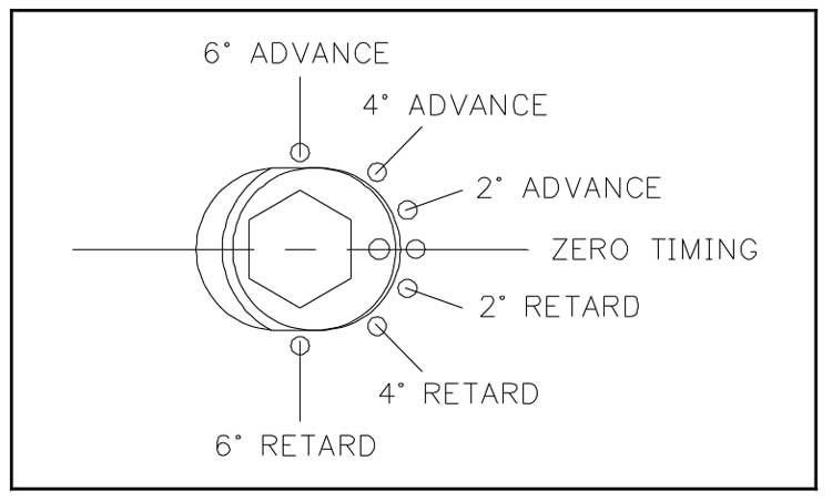 Hex-A-Just True Roller Timing Set #9-3172A (Chevy LS2 – Late, 3 Hub Cam Sprkt, Single Roller) Instrucciones de instalación | Alto rendimiento |mayo 11, 2019 ANTES DE EMPEZAR: ¡¡¡LEA PRIMERO TODAS ESTAS INSTRUCCIONES!!! Nota: Los procedimientos de instalación que siguen suponen que el motor ha sido desmontado y limpiado como lo sería para un cambio normal de juego de distribución. NECESITARÁS: HERRAMIENTAS: Llave de vaso hexagonal de 1/4″ o llave hexagonal Llave dinamométrica Martillo Manguito para encajar sobre el cigüeñal para instalar el piñón del cigüeñal Rueda de grados (opcional, pero recomendada) SUMINISTROS: Lubricante de montaje o del árbol de levas Prepara el motor. Aflojar todos los balancines para que el árbol de levas pueda girar libremente. ¡Limpia todo! Asegúrese de que las superficies de montaje del motor y los componentes del juego de distribución estén lo más limpios posible. La vida de la cadena y los rodamientos depende de ello. Montar el piñón del cigüeñal. Seleccione el chavetero apropiado para la línea de base de la distribución del árbol de levas deseada. Recomendamos la posición de sincronización estándar, que utiliza la marca de sincronización redonda y la marca de chaveta redonda. Coloque con cuidado el piñón en el cigüeñal utilizando un manguito para proteger el piñón. Asegúrese de que la rueda dentada esté completamente asentada en el cigüeñal. Gire el cigüeñal hasta que la marca de sincronización de la rueda dentada del cigüeñal correspondiente esté en la posición 12:00. Asegúrese de que el pistón número uno está en el punto muerto superior. Inserte el casquillo de sincronización Hex-A-Just®. Inserte el casquillo desplazado (con el agujero hexagonal) en la ranura del cubo del piñón del árbol de levas. Gírelo con una llave hexagonal de 1/4″ de manera que la marca de sincronización del buje apunte hacia fuera del centro del mismo (Figura 1). El buje de sincronización ajustable Hex-A-Just® es infinitamente ajustable para que usted pueda ajustar la sincronización del eje de levas de su motor EXACTAMENTE DONDE USTED QUIERE. Instale el cojinete de empuje del árbol de levas. Instale el rodamiento de agujas de empuje en la parte posterior del cubo del engranaje del árbol de levas con el lado negro del rodamiento hacia el bloque. Si no se hace así, se producirá un grave problema de desgaste. Montar el piñón del árbol de levas. Pase la cadena por encima del piñón del árbol de levas. Alinee las marcas de sincronización del árbol de levas y del cigüeñal y haga un bucle con la cadena alrededor del piñón del cigüeñal. Levante el piñón del árbol de levas en su lugar en el árbol de levas, con el buje Hex-A-Just® en su lugar. Asegúrese de que la marca de sincronización se alinea con la marca de sincronización del cigüeñal. Arrancar los tornillos del árbol de levas para sujetar el piñón de la leva en su sitio, pero dejar los tornillos ligeramente sueltos. Ajuste la sincronización del árbol de levas. NO intente girar el árbol de levas con el casquillo a menos que no haya CARGA en el árbol de levas. No debe haber PRESIÓN DEL MUELLE DE LA VÁLVULA contra el árbol de levas o el casquillo Hex-A-Just® se PARTIRÁ. Asegúrese de que los tres tornillos del árbol de levas están sueltos. Para una instalación sencilla, ajuste el casquillo Hex-A-Just® al ajuste de sincronización deseado (Figura 2). Para una instalación más precisa, utilice una rueda de grados. Se recomienda encarecidamente el método de la rueda de grados. Apriete los tornillos sueltos. Apriete los tres (3) tornillos de montaje del piñón de leva a 300 in-lb (25 ft-lb). Lubricar el juego de distribución. Asegúrese de que el aceite del motor tiene un camino libre hacia el juego de distribución a través de los agujeros de drenaje de aceite del valle del elevador, o a través de algún otro medio. Un juego de distribución requiere mucho aceite para sobrevivir. Antes de instalar la junta de la tapa de distribución y la tapa de distribución, vierta abundante lubricante de montaje sobre los piñones y los cojinetes. El lubricante de montaje permanecerá en los piñones hasta que el motor se ponga en marcha. Instale el conductor de la bomba de aceite. Utilizando un manguito, presione con cuidado el impulsor de la bomba de aceite en la nariz del cigüeñal hasta que el impulsor esté en contacto duro con la rueda dentada del cigüeñal. Tapa y junta de distribución. Instale la junta de la tapa de la distribución utilizando una pequeña cantidad de sellador de juntas si lo desea. Monte la tapa de la distribución e instale los pernos de montaje. Apriete estos tornillos según lo especificado por el fabricante. BACK