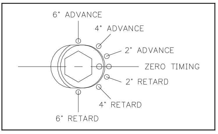 Juego de distribución Hex-A-Just True Roller #9-3147A (BB Chevy Merlin) Instrucciones de instalación | Alto rendimiento |mayo 19, 2019 ANTES DE EMPEZAR: ¡¡¡LEA PRIMERO TODAS ESTAS INSTRUCCIONES!!! Nota: Los procedimientos de instalación que siguen suponen que el motor ha sido desmontado y limpiado como lo sería para un cambio normal de juego de distribución. NECESITARÁS: HERRAMIENTAS: Llave de vaso hexagonal de 1/4″ o llave hexagonal Llave dinamométrica Martillo Manguito para encajar sobre el cigüeñal para instalar el piñón del cigüeñal Rueda de grados (opcional, pero recomendada) SUMINISTROS: Lubricante de montaje o del árbol de levas Compuesto de bloqueo de roscas (LockTite® #271 o equiv.) Botón de leva Cloyes (número de pieza 9-200 o 9-202) (opcional, pero recomendado). Prepara el motor. Aflojar todos los balancines para que el árbol de levas pueda girar libremente. ¡Limpia todo! Asegúrese de que las superficies de montaje del motor y los componentes del juego de distribución estén lo más limpios posible. La vida de la cadena y los rodamientos depende de ello. Montar el piñón del cigüeñal. Seleccione el chavetero apropiado para la línea de base de la distribución del árbol de levas deseada. Recomendamos la posición de sincronización estándar, que utiliza la marca de sincronización redonda y la marca de chaveta redonda. Coloque con cuidado el piñón en el cigüeñal utilizando un manguito para proteger el piñón. Asegúrese de que la rueda dentada esté completamente asentada en el cigüeñal. Gire el cigüeñal hasta que la marca de sincronización de la rueda dentada del cigüeñal correspondiente esté en la posición 12:00. Asegúrese de que el pistón número uno está en el punto muerto superior. Inserte el casquillo de sincronización Hex-A-Just®. Inserte el casquillo desplazado (con el agujero hexagonal) en la ranura del cubo del piñón del árbol de levas. Gírelo con una llave hexagonal de 1/4″ de modo que la marca de sincronización del buje apunte hacia fuera del centro del mismo (Figura 1). El casquillo de sincronización ajustable Hex-A-Just® es infinitamente ajustable para que usted pueda ajustar la sincronización del eje de levas de su motor EXACTAMENTE DONDE USTED QUIERE Instale el cojinete de empuje del árbol de levas. Instale el rodamiento de agujas de empuje en la parte posterior del engranaje del árbol de levas con el lado negro del rodamiento hacia el cubo del engranaje, de modo que el lado plateado del rodamiento estará orientado hacia el bloque. Montar el piñón del árbol de levas. Pase la cadena por encima del piñón del árbol de levas. Alinee las marcas de sincronización del árbol de levas y del cigüeñal y haga un bucle con la cadena alrededor del piñón del cigüeñal. Levante el piñón del árbol de levas en su lugar en el árbol de levas, con el cojinete de empuje y el buje HexA-Just® en su lugar. Asegúrese de que la marca de sincronización se alinee con la marca de sincronización del cigüeñal y de que el cojinete de empuje no se haya salido del hombro del cubo de la rueda dentada. Atorníllelo en su lugar utilizando los pernos GM existentes o equivalentes. Instale estos tornillos ligeramente sueltos. Instalar el botón de la leva. Instale el botón de la leva siguiendo las instrucciones adjuntas. Ajuste la sincronización del árbol de levas. NO intente girar el árbol de levas con el casquillo a menos que no haya CARGA en el árbol de levas. No debe haber PRESIÓN DEL MUELLE DE LA VÁLVULA contra el árbol de levas o el casquillo Hex-A-Just® se PARTIRÁ. Asegúrese de que los tres tornillos del árbol de levas están sueltos. Para una instalación sencilla, ajuste el casquillo Hex-A-Just® al ajuste de sincronización deseado (Figura 2). Para una instalación más precisa, utilice una rueda de grados. Se recomienda encarecidamente el método de la rueda de grados. Apriete los tornillos sueltos. Retire cada uno de los tres pernos, uno a la vez, y aplique el compuesto de bloqueo de roscas, luego apriete cada perno a 300 in-lb (25 ft-lb). Lubricar el juego de distribución. Asegúrese de que el aceite del motor tiene un camino libre hacia el juego de distribución a través de los agujeros de drenaje de aceite del valle del elevador, o a través de algún otro medio. Un juego de distribución requiere mucho aceite para sobrevivir. Antes de instalar la junta de la tapa de distribución y la tapa de distribución, vierta abundante lubricante de montaje sobre los piñones y los cojinetes. El lubricante de montaje permanecerá en los piñones hasta que el motor se ponga en marcha. Instale la tapa de la distribución y la junta. Apriete los tornillos a 160 in-lb (13 ft-lb). BACK