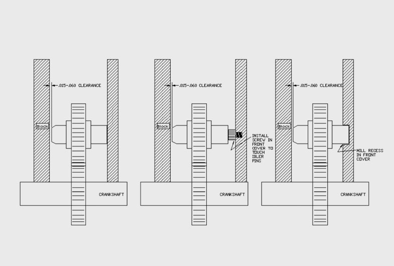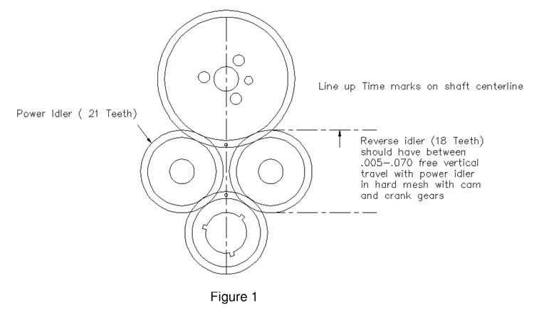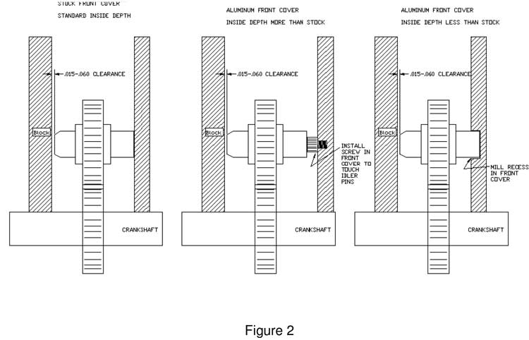 Transmisión de engranajes #8-5100 (SB Chevy) Instrucciones de instalación | Alto rendimiento |junio 10, 2019 ANTES DE EMPEZAR: ¡¡¡LEA PRIMERO TODAS ESTAS INSTRUCCIONES!!! Nota: Los procedimientos de instalación que siguen suponen que el motor ha sido desmontado y limpiado como lo sería para un cambio normal de juego de distribución. A continuación se exponen algunas notas importantes relativas a la instalación de este reductor. El engranaje de la rueda loca inversa (rueda loca de 18 dientes) debe tener entre 0,005 y 0,070 de recorrido vertical cuando el conjunto está instalado en el motor con la polea loca de potencia (polea loca de 21 dientes) en engranaje duro entre el cigüeñal y los engranajes de la leva. Si no es el caso excesivo, se puede generar calor causando daños en el conjunto de engranajes. La finalidad del engranaje de marcha atrás es evitar que la polea tensora se desenganche cuando el cigüeñal gira hacia atrás, como ocurre al apagar el motor. El motor se cronometra con las marcas de sincronización enfrentadas, tal y como se haría con una transmisión de cadena y piñón. (Véase la figura 1) Si no se utiliza una tapa de distribución de fábrica, puede ser necesario realizar un pequeño mecanizado en la tapa de distribución para utilizarla con este juego. Los pasadores de las ruedas locas siempre estarán en contacto con la tapa de la distribución durante su uso. La parte posterior de los pasadores de la polea loca debe tener una holgura mínima de 0,015 con respecto al bloque. La transmisión de engranajes de rueda loca doble está pensada para su uso con un equilibrador armónico. No se puede utilizar con un buje de aluminio. Instrucciones de instalación En primer lugar, coloque el anillo de desgaste de bronce en el lado del contrataladro del engranaje del árbol de levas. Una pequeña cantidad de grasa mantener el anillo en su lugar durante la instalación del engranaje de leva. Instale el engranaje del árbol de levas en el árbol de levas y apriete según las especificaciones de fábrica. Instale el engranaje del cigüeñal en el cigüeñal utilizando el chavetero deseado. El chavetero redondeado es para la sincronización estándar del árbol de levas. El chavetero en forma de triángulo es para el avance del árbol de levas de 4 grados, mientras que el chavetero de punta plana es para el retardo del árbol de levas de 4 grados. Alinee las marcas de sincronización como se muestra en la Figura 1. Instale el soporte de la polea tensora en su lugar. (Puede ser necesario girar ligeramente el motor para alinear los engranajes) Una vez colocado el soporte de la polea tensora, gire el cigüeñal ligeramente hacia delante para colocar la polea tensora en el engranaje duro. La polea de inversión debe tener entre 0,005 y 0,070 de recorrido vertical. Tire de los engranajes de la polea loca hasta la mitad de su engranaje con el engranaje de la manivela. Con la junta de la tapa de la distribución en su lugar, tomar la tapa de la distribución y empujar en su lugar. Retire la tapa de la distribución y ahí es donde el soporte de la polea loca se ejecutará. Si la parte delantera de los engranajes de la polea tensora no se alinea con la parte delantera de los engranajes del cigüeñal, es necesario mecanizar la tapa de distribución. (Véase la figura 2.) Una vez completada la alineación del engranaje de la polea tensora, compruebe la holgura entre los pernos de la polea tensora y el bloque. Debe haber entre 0,015 y 0,060 de holgura. Desmonte el soporte de la polea tensora y rectifique el extremo del pasador de la polea tensora si es necesario para conseguir la holgura necesaria. Vuelva a colocar el soporte de la polea loca, instale el botón de la leva e instale la tapa de la distribución. BACK