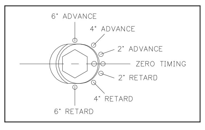 DOWNLOAD PDF Hex-A-Just #9-3100A (SB Chevy) Installation instructions | High Performance |June 2, 2019 BEFORE YOU BEGIN: READ ALL OF THESE INSTRUCTIONS FIRST !!! Note: The installation procedures which follow assume that the engine has been disassembled and cleaned as it would be for a normal timing set change. YOU WILL NEED: TOOLS: 1/4″ Hex Bit Socket or Hex Wrench Torque Wrench Hammer Sleeve to fit over crankshaft for installing Crankshaft Sprocket Degree Wheel (Optional, but Recommended) SUPPLIES: Assembly Lube or Camshaft Lube Thread Locking Compound (LockTite® #271 or equiv.) Cloyes Cam Button (Part Number 9-200 or 9-202) (Optional, but Recommended). Prepare the Engine. Loosen all rocker arms so that the camshaft can rotate freely. Clean everything! Make sure that the engine mounting surfaces and timing set components are as clean as possible. The life of the chain and bearings depends on it. Mount the Crankshaft Sprocket. Select the appropriate keyway for the camshaft timing baseline desired. We recommend the Standard Timing position, which used the round timing mark and round keyway mark. Carefully tap the sprocket onto the crankshaft using a sleeve to protect the sprocket. Make sure that the sprocket is fully seated on the crankshaft. Rotate the crankshaft until the appropriate crankshaft sprocket timing mark is in the 12:00 position. Make sure that the number one piston is at top dead center. Insert the Hex-A-Just® Timing Bushing. Insert the offset bushing (with the Hex hole) into the slot in the camshaft sprocket hub. Rotate it with a 1/4″ Hex Wrench so that the timing mark on the bushing points away from the center of the hub (Figure 1). The Hex-A-Just® Adjustable Timing Bushing is infinitely adjustable so you can fine adjust your engine’s CAMSHAFT TIMING to EXACTLY WHERE YOU WANT IT. Install the Camshaft Thrust Bearing. Install the Thrust Needle Bearing on the back side of the camshaft gear with the black side of the bearing facing gear hub, so the silver side of the bearing will be facing the block. Mount the Camshaft Sprocket. Loop the chain over the camshaft sprocket. Align the camshaft and crankshaft timing marks and loop the chain around the crankshaft sprocket. Lift the camshaft sprocket into place on the camshaft, with the Thrust Bearing and HexA-Just® Bushing in place. Be sure that the timing mark aligns with the crankshaft timing mark, and that the Thrust Bearing has not slipped off of the shoulder on the sprocket hub. Bolt it in place using the existing GM bolts or equivalent. Install these bolts slightly loose. Install the cam button. Install the cam button using the instructions enclosed with it. Adjust the Camshaft Timing. Do NOT try to turn the camshaft with the bushing unless there is NO LOAD on the camshaft. There must be NO VALVE SPRING PRESSURE against the camshaft or the Hex-A-Just® bushing will SPLIT. Make sure that the three camshaft bolts are LOOSE. For a simple installation, adjust the Hex-A-Just® bushing to the desired timing setting (Figure 2). For a more accurate installation, use a degree wheel. The degree wheel method is strongly recommended. Torque Loose Bolts. Remove each of the three bolts, one at a time, and apply the thread Locking Compound, then torque each bolt to 300 in-lb (25 ft-lb). Lubricate the Timing Set. Make sure that the engine oil has a clear path to the timing set through the lifter valley oil drain-back holes, or through some other means. A timing set requires plenty of oil to survive. Before installing the timing cover gasket and timing cover, pour plenty of assembly lube over the sprockets and bearings. Assembly lube will stay on the sprockets until the engine is started. Install the Timing Cover and Gasket. Torque these bolts to 160 in-lb (13 ft-lb). DOWNLOAD PDF BACK