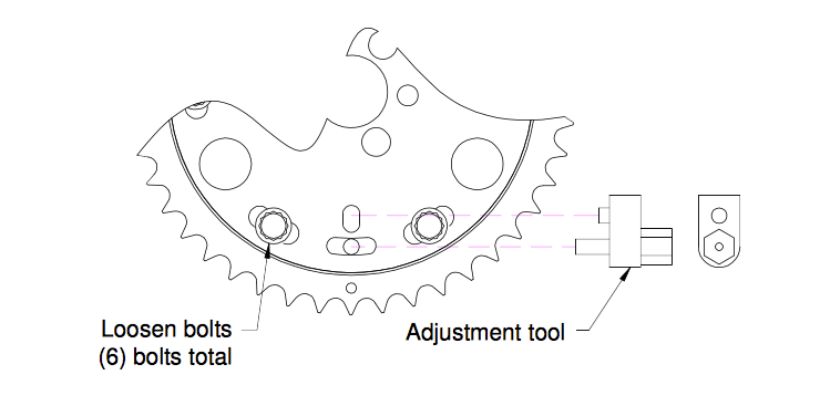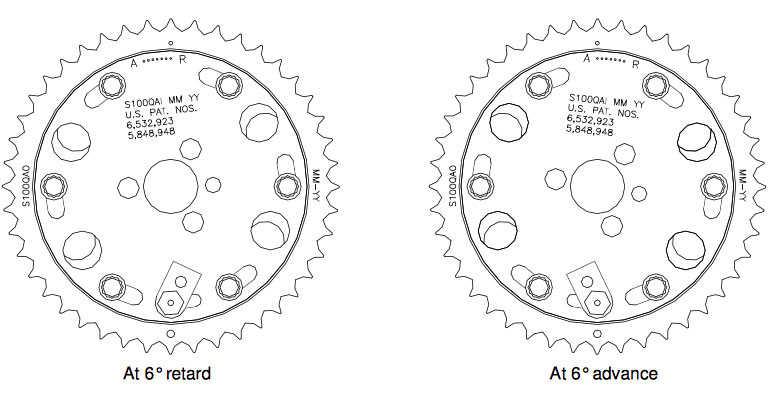 DOWNLOAD PDF Quick Adjust™ Timing System Installation instructions | High Performance |June 5, 2019 Note: If you are using the 3-keyway crank sprocket and using the advanced keyway, the maximum camshaft advance will be 8o and maximum retard will be 4o. If using the retard keyway, the maximum advance will be 4o and maximum retard will be 8o. Remember that the camshaft angle is half of the crankshaft angle (Refer to the 3-keyway crank sprocket installation instructions). The Cloyes® Patented Quick AdjustTM Timing System allows the installer to adjust the camshaft timing up to 12°. Some camshaft manufacturers instruct the user to advance or retard camshaft timing to enhance the characteristics of their camshaft. By loosening six bolts and using the adjusting tool provided, the user can infinitely adjust the camshaft timing up to 6° advance or 6° retard. To adjust the timing, loosen the six bolts that clamp the inner member of the camshaft sprocket to the outer member about 1/4 turn counter clockwise. Insert adjustment tool into the slots provided. The short shaft of the adjustment tool will be inserted into the short slot. The long shaft will be inserted into the long slot and hole (Refer to illustration below). After the tool is inserted into the slots, use a 3/8 wrench to rotate the tool. There are seven timing marks indicated with an A and an R on the ends. Each timing mark is approximately 2° and is lined up with a single alignment mark on the outer camshaft sprocket member (Refer to illustration below). After the timing has been adjusted, remove the adjusting tool from the cam sprocket. Tighten the six bolts to 13-15 ft-lb. Note: The above illustrations are GM camshaft sprockets. However, the adjustments are the same for a Ford or Chrysler applications. DOWNLOAD PDF BACK